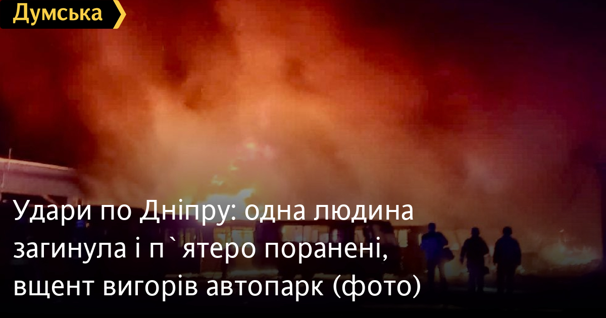 Удари по Дніпру: одна людина загинула і п`ятеро поранені, вщент вигорів автопаркОдна людина загинула і п’ятеро травмовані в результаті удару «Іскандерів» по Дніпру. Ворожі ракети знищили автопарк, заявив голова Дніпропетровської ОВА Валентин Резніченко. «Під час пожежі, яку спричинив удар, згоріли 52 автобуси, ще машин 98 пошкоджені», — йдеться у повідомленні. У місті понівечені кілька багатоповерхівок, гімназія, магазин та адміністративні будівлі. Гаряче вночі було і на Нікопольщині. Росіяни тричі вгатили по району «Градами» та важкою артилерією. У Червоногригорівській громаді пошкоджено промислові об’єкти, десяток приватних будинків, водопровід та лінію електропередач. У Нікополі снаряди зачепили приватні оселі. Там минулося без загиблих та поранених. СМЕРТЬ РОСІЙСЬКИМ ОКУПАНТАМ! Помітили помилку? Виділяйте слова з помилкою та натискайте control-enter |
