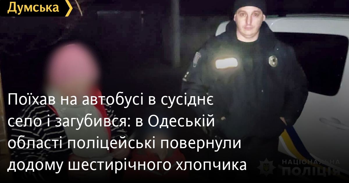 Поїхав на автобусі в сусіднє село і загубився: в Одеській області поліцейські повернули додому шестирічного хлопчикаБатьків шестирічного хлопчика, який доїхав до кінцевої автобусної зупинки в Білгород-Дністровському районі і не знав, як повернутися додому, розшукали правоохоронці. Поки мати займалася домашніми справами, син пішов гуляти і вирішив покататися на автобусі та поїхав у сусіднє село, розповіли в ГУНП. Дитину без супроводу дорослих помітив водій. Хлопчик не відповідав на запитання про себе, тому чоловік викликав поліцію. Правоохоронці забрали хлопчика до відділку та почали пошук його батьків. За кілька годин на лінію 102 зателефонували сусіди дитини, які впізнали її на фото в орієнтуванні, яке поширили у ЗМІ та соцмережах. Як виявилося, мати увесь цей час намагалася розшукати сина самостійно і навіть не підозрювала, що він опинився так далеко від дому. Хлопчика повернули рідним, а на матір склали адмінпротокол за ч.1 ст. 184 КУпАП за неналежне виконання обов'язків щодо виховання дитини. СМЕРТЬ РОСІЙСЬКИМ ОКУПАНТАМ! Помітили помилку? Виділяйте слова з помилкою та натискайте control-enter Новини по цій темі: 29 липня 2025: В Усатово Одеської області сталася перестрілка: поліція працює на місці (відео, оновлено) 28 липня 2025: П'яний на "Ягуарі" або гіпертонік? Звільнений топ-посадовець одеської поліції хоче повернутися на службу 19 червня 2025: Дівчинку, яку шукали сотні одеситів, знайшли вбитою: поліція працює з чоловіком, ймовірно причетним до загибелі 27 травня 2025: Увели гектар в університету: на Одещині засудили земельних аферистів, але без посадки і Хвоста |