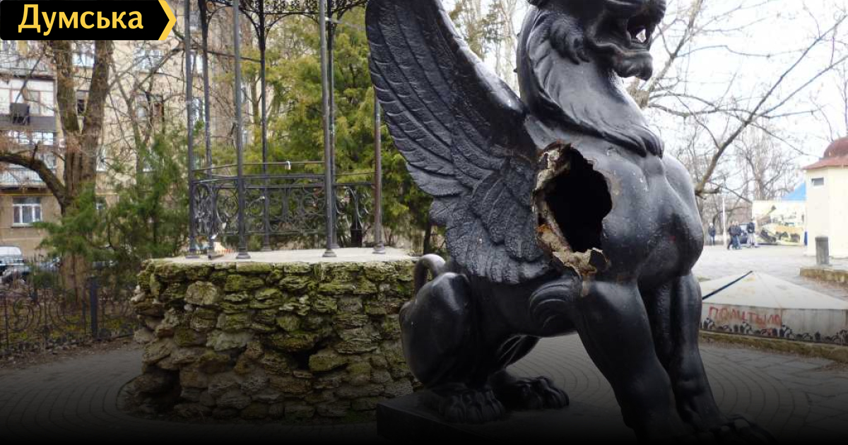 «Уголок старой Одессы» в центре города, у Тещиного моста, сегодня больше напоминает свалку — кругом лежат горы мусора и пустые бутылки, в статуе грифона зияет огромная дыра.