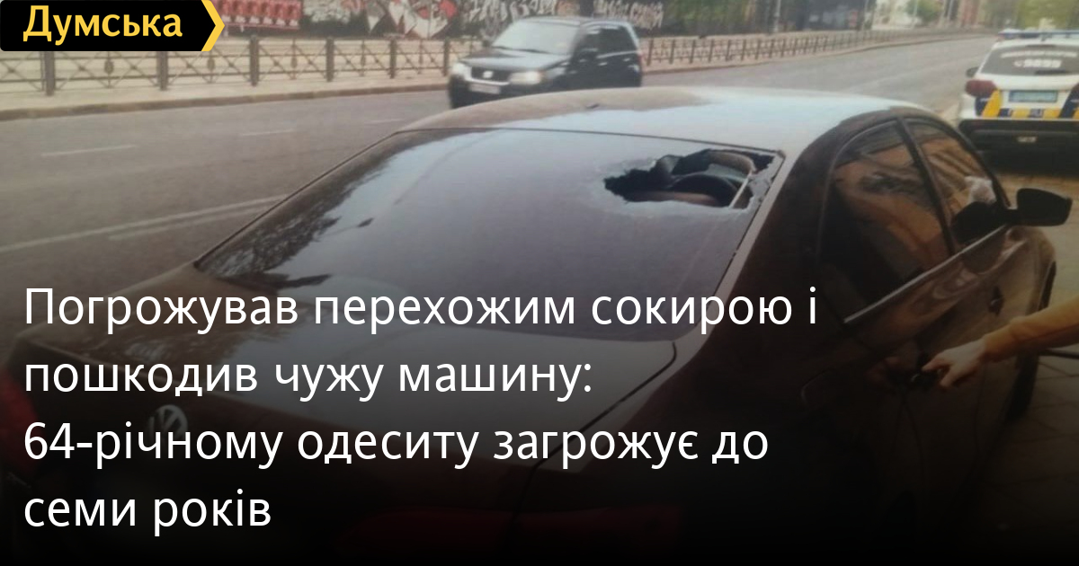 Погрожував перехожим сокирою і пошкодив чужу машину: 64-річному одеситу загрожує до семи роківОдеситу, який пошкодив чужу машину, а також погрожував людям сокирою, повідомили про підозру у хуліганстві. Як розповіли у пресслужбі поліції Одеської області, подія трапилася вдень у дворі будинку на узвозі Маринеско, де живе 64-річний чоловік. Він причепився до водія, який сидів у своїй машині, почав лаятися і погрожувати йому ножем. Коли останній спробував заспокоїти хулігана, той ще більше розійшовся і пошкодив ножем машину, зробивши отвір у вітровому склі та вм'ятини на дверцятах. Після цього він пішов додому. Сума завданих збитків склала понад 19 тис. гривень. Через деякий час одесит знову вийшов на вулицю, але цього разу вже з сокирою, став ображати перехожих і погрожувати розправою двом чоловікам, які розмовляли між собою, і юнакові, який вийшов із під'їзду. Налякавши людей, він знову пішов додому. Люди звернулися в поліцію і правоохоронці повідомили хулігану про підозру за ч. 4 ст. 296 Кримінального кодексу України. Йому загрожує від трьох до семи років позбавлення волі. Суд відправив підозрюваного під домашній арешт. Помітили помилку? Виділяйте слова з помилкою та натискайте control-enter Новини по цій темі: 29 липня 2025: В Усатово Одеської області сталася перестрілка: поліція працює на місці (відео, оновлено) 28 липня 2025: П'яний на "Ягуарі" або гіпертонік? Звільнений топ-посадовець одеської поліції хоче повернутися на службу 19 червня 2025: Дівчинку, яку шукали сотні одеситів, знайшли вбитою: поліція працює з чоловіком, ймовірно причетним до загибелі 27 травня 2025: Увели гектар в університету: на Одещині засудили земельних аферистів, але без посадки і Хвоста |