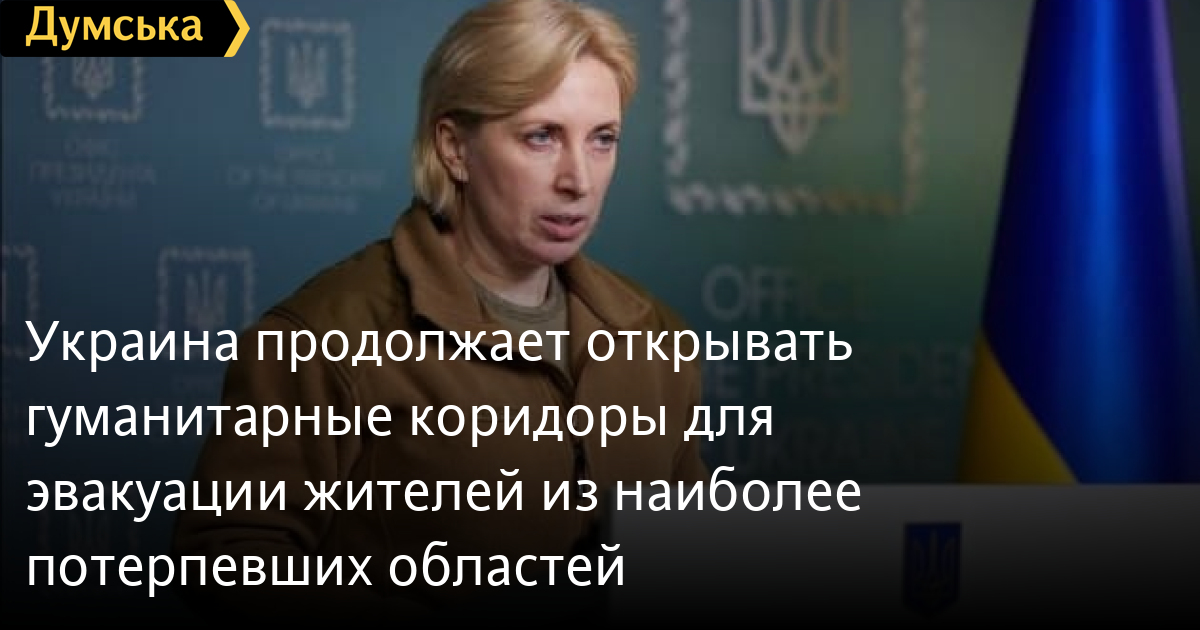 Украина продолжает открывать гуманитарные коридоры для эвакуации жителей из наиболее потерпевших областейВице-премьер, министр по вопросам реинтеграции временно оккупированных территорий Ирина Верещук назвала маршруты «зеленых» коридоров, которые открываются 12 марта. «Из Запорожья в Мариуполь выходит колона с гуманитарным грузом и автобусами для эвакуации людей на обратном пути по маршруту: Запорожье- Васильевка- Мелитополь- Бердянск- Мангуш- Мариуполь. Направление разминируют»,- сообщила Верещук. Из города Пологи в Запорожье: Пологи- Токмак- Васильевка- Каменское- Запорожье.