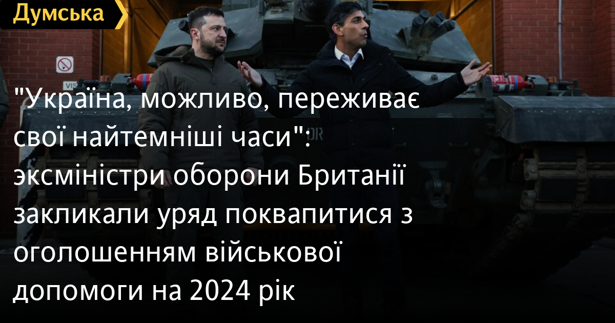 Поквапитися з оголошенням розміру військової допомогиУкраїні на 2024 рік закликали уряд Ріші Сунака колишні міністри оборони Великої Британії Консервативної партії Майкл Феллон, Бен Воллес, Ліам Фокс і Гевін Вільямсон.
