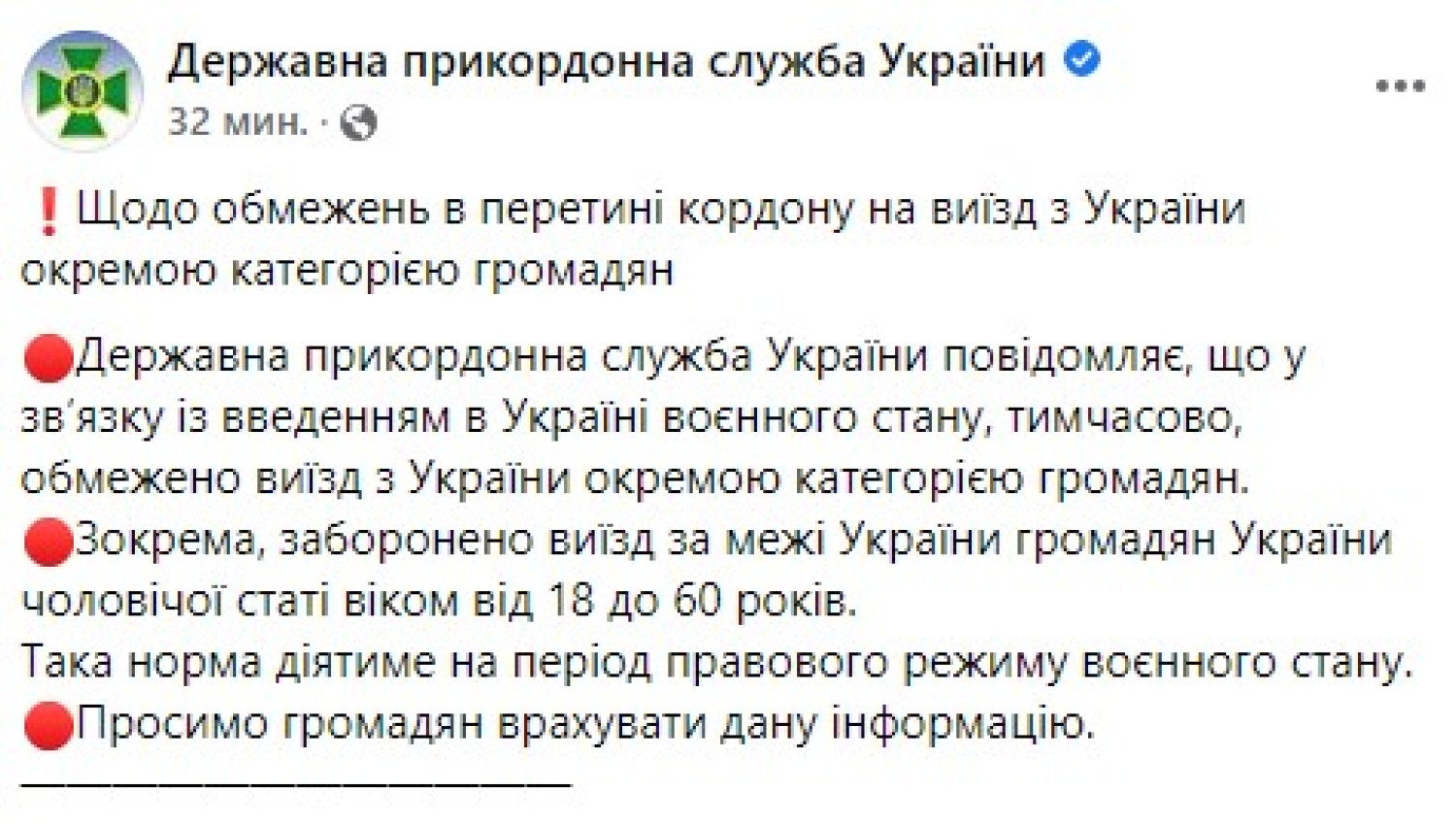 Украина запретила выезд из страны мужчинам в возрасте от 18 до 60 лет, — ГоспогранслужбаГосударственная пограничная служба Украины сообщила, что в связи с введением в стране военного положения временно ограничен выезд из страны мужчинам, гражданам Украины в возрасте от 18 до 60 лет. Об этом сообщила пресс-служба Госпогранслужбы. Отмечается, что эта норма будет действовать в период правового режима военного положения. СМЕРТЬ РОСІЙСЬКИМ ОКУПАНТАМ! Помітили помилку? Виділяйте слова з помилкою та натискайте control-enter |
