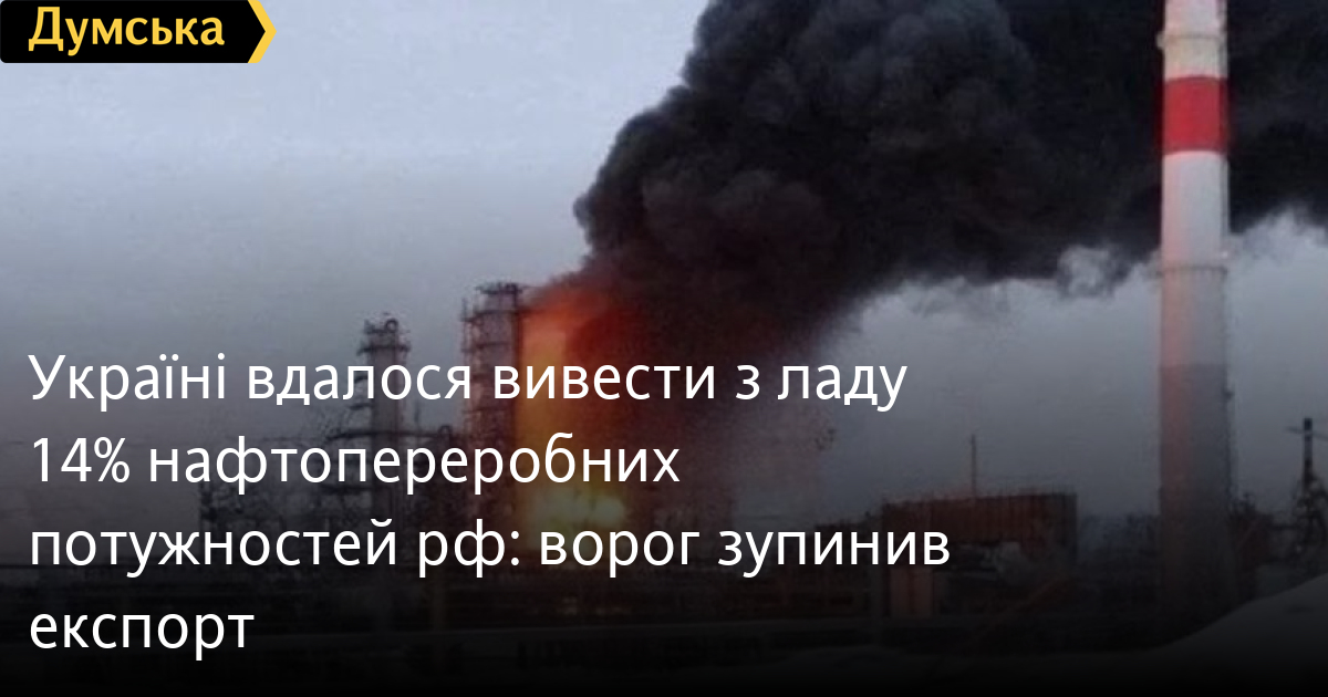 До 14% нафтопереробних потужностей росії вдалося вивести з ладу Силам оборони України, які регулярно завдають дронові удари по території країни-агресора.