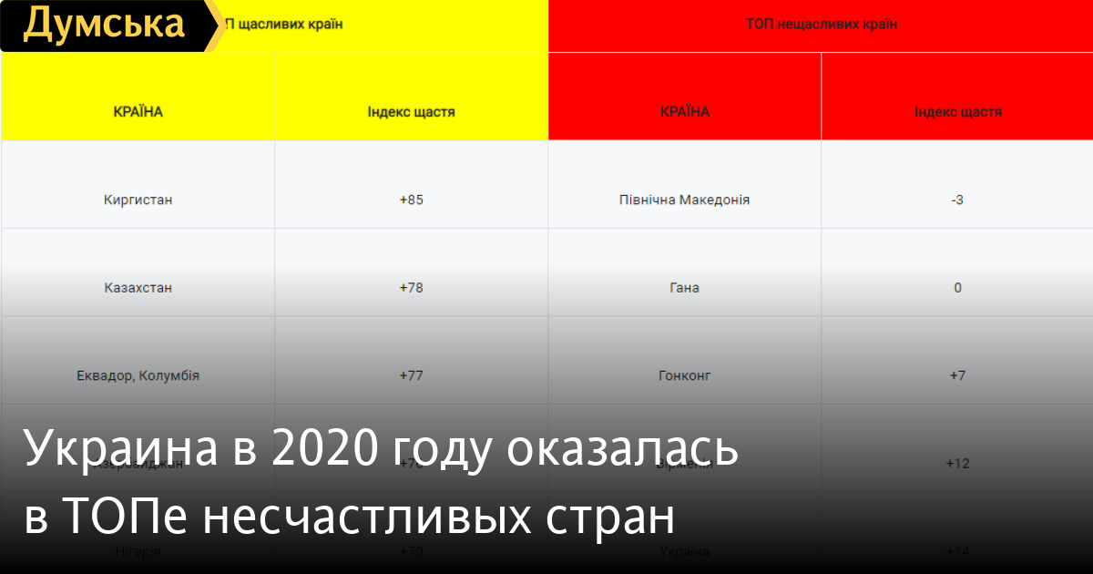 Согласно результатам международного глобального опроса Gallup International, Украина в прошлом году оказалась в ТОПе несчастливых стран. Об этом сообщила пресс-служба фонда Демократические инициативы им. Илька Кучерива. Опрос проводился в 41 стране мира среди более 38 тысяч человек. Согласно результатам исследования, более половины респондентов (54%) считают себя счастливыми, только 14% говорят, что они несчастны. А 31% опрошенных считают себя ни счастливыми, ни несчастными. Таким образом, средний индекс счастья в мире составляет 40%. Но вот в Украине он значительно ниже — 14%. Причем этот показатель сильно снизился по сравнению с 2019 годом, когда он составлял 33%, но в 2018 индекс счастья в нашей стране составлял всего 8%. При этом количество счастливых украинцев больше, чем несчастливых: 49% и 35% соответственно. В исследовании подчеркивается, что за год количество счастливых людей почти не изменилось, а падении индекса счастья произошло из-за роста количества несчастливых. Несмотря на это 37% наших сограждан верят, что 2021 год будет лучше, чем 2020. СМЕРТЬ РОССИЙСКИМ ОККУПАНТАМ! Заметили ошибку? Выделяйте слова с ошибкой и нажимайте control-enter |
