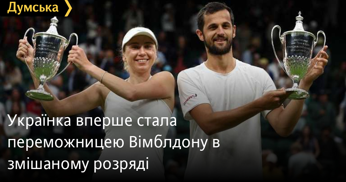 Українка вперше стала переможницею Вімблдону в змішаному розрядіУкраїнка Людмила Кіченок у парі з хорватом Мате Павичем виграла фінал Вімблдону в парному розряді проти Сюй Іфань із Китаю та Йорана Флігена з Бельгії. Про це повідомила пресслужба турніру. Зазначимо, що це перша в історії перемога представника України в змішаному розряді на турнірі «Великого шолома». Матч за участю українки та хорвата закривав програму ігрового дня і проходив на центральному корті. У першому сеті вони взяли всуху гейм на подачі суперників, вийшовши вперед із рахунком 4:3. Отриманої переваги вистачило для того, щоб виграти і сет із результатом 6:4. Другу партію Кіченок і Павич закінчували на тай-брейку. Жодній із пар тенісистів не вдалося зробити брейк на подачі суперників. На тай-брейку українка та хорват мали одразу дві можливості, щоб закінчити матч у другому сеті, але не змогли ними скористатися. Натомість бельгієць і китаянка вирвали перемогу і перевели гру в третю партію. У вирішальному сеті Павич і Кіченок зробили брейк за рахунку 4:3. А в останньому геймі реалізували матч-пойнт і перемогли. Останнього переможного удару завдала саме Кіченок. Результат фіналу: Мате Павич (Хорватія)/ Людмила Кіченок (Україна) — Йоран Фліген (Бельгія)/ Іфан Сюй (Китай) 2:1 (6:4, 6:7, 6:3).