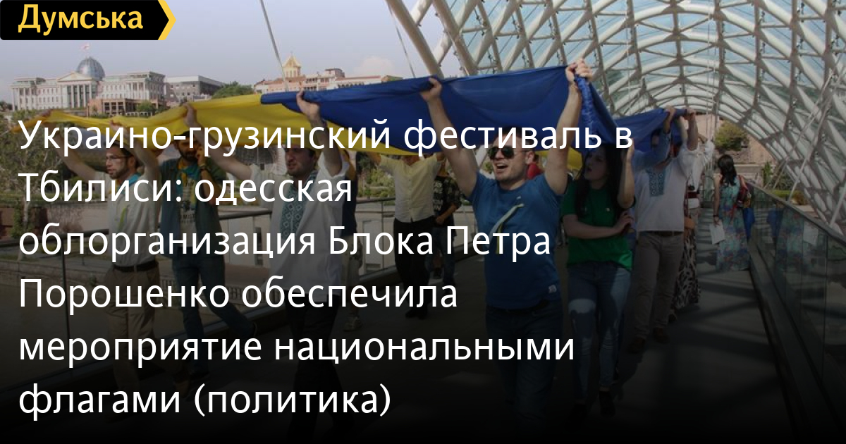 Украино-грузинский фестиваль в Тбилиси: одесская облорганизация Блока Петра Порошенко обеспечила мероприятие национальными флагами (политика)30 мая в столице Грузии Тбилиси прошел благотворительный фестиваль «Украина – Грузия, два сердца – одна душа!». Мероприятие проходила в городском парке Рике. В рамках действа прошли концерты украинских коллективов, фотовыставки, флешмобы и акции. На фестивале были представлены разнообразные украинские сувениры, но самой большой популярностью, по словам организаторов, пользовались сине-желтые флаги. «Весь парк был в тот день сине-желтым. Каждый грузин хотел получить для себя украинский флаг», — отметила организатор праздника Лилия Гричулевич. По ее словам, огромное количество украинских флагов для фестиваля передала Одесская областная организация Блока Петра Порошенко «Солидарность» во главе с Михаилом Шмушковичем. СМЕРТЬ РОССИЙСКИМ ОККУПАНТАМ! Заметили ошибку? Выделяйте слова с ошибкой и нажимайте control-enter