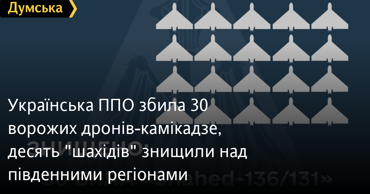 У командуванні Повітряних сил Збройних сил України повідомили, що ППО знищили 30 безпілотників.