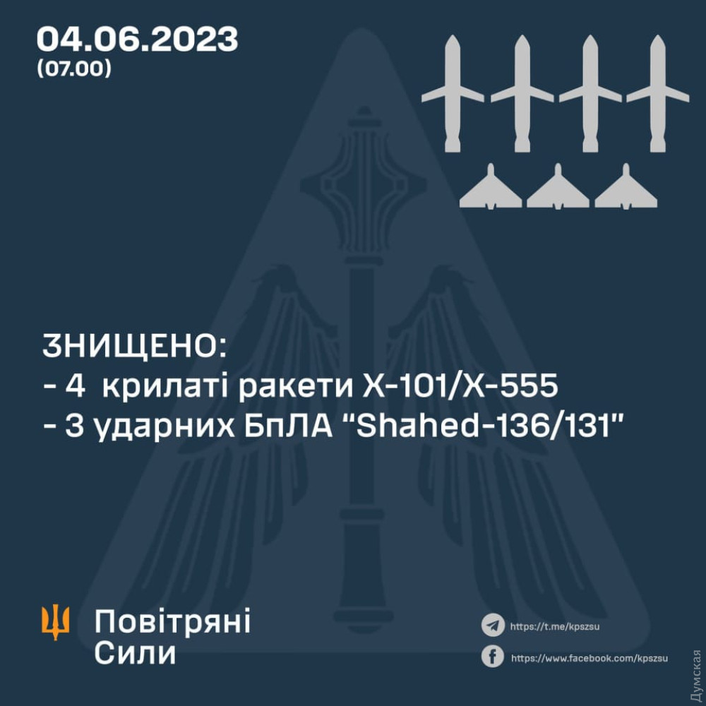 Чотири крилаті ракети Х-101/Х-555 і три дрони-камікадзе Shahed-136 знищили наші зенітники минулої ночі.