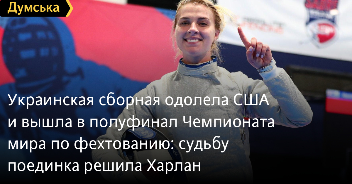 Українська збірна здолала США та вийшла до півфіналу Чемпіонату світу з фехтування: долю поєдинку вирішила ХарланМиколаївська фехтувальниця Ольга Харлан, яка кілька днів тому відмовилася потиснути руку суперниці з росії та змінила правила світового спорту, знову викликала фурор — її перемога над суперницею зі США принесла українській збірній путівку до півфіналу Чемпіонату світу з фехтування. У вирішальному поєдинку Харлан здолала Елізабет Тартаковскі, наша збірна перемогла з рахунком 45:44. У півфіналі на наших шаблісток Ольгу Харлан, Аліну Комащук, Олену Кравацьку та Юлію Бакастову чекає поєдинок із француженками. СМЕРТЬ РОСІЙСЬКИМ ОКУПАНТАМ! Помітили помилку? Виділяйте слова з помилкою та натискайте control-enter |