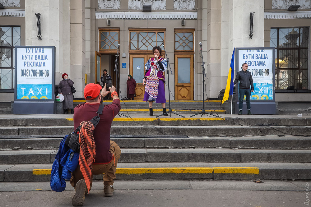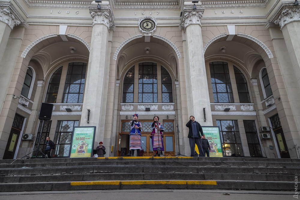 Музыкальный концерт «Одесса в бой идет без драмы» прошел сегодня утром у главного входа на железнодорожный вокзал и стал, пожалуй, единственной outdoor-активностью непраздничной Юморины.