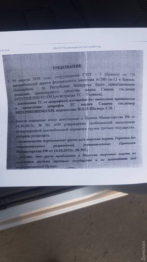 Как передает корреспондент «Думской», на крайние меры перевозчики пошли из-за нового витка торговой войны, которую развязала против нашей страны Российская Федерация. На днях там снова начали задерживать украинские грузовые машины, которые возят грузы из России в третьи страны (в том числе Израиль) через территорию Украины, и нещадно штрафовать владельцев транспортных средств.