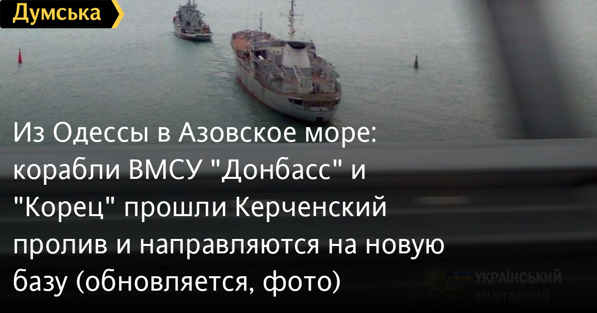 Сегодня утром «Донбасс» и «Корец» вошли в контролируемый оккупантами Керченский пролив и сейчас находятся возле моста, соединяющего полуостров Тамань и Крым.