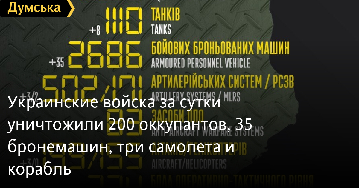 Украинские войска за сутки уничтожили 200 оккупантов, 35 бронемашин, три самолета и корабльОккупанты ежедневно несут тяжелые потери на украинской земле. Вчера список уничтоженных захватчиков увеличился на 200 солдат и офицеров. С начала же полномасштабного вторжения свой конец нашли 24900 российских военных. По данным Генерального штаба Вооруженных сил Украины, вчера были уничтожены восемь вражеских танков (1100) и 35 бронемашин (2686). Сожжены три артиллерийские системы (502) и две реактивные системы залпового огня (171), а также 19 автомобилей (1926). Сбиты три самолета (199). Уничтожен еще один российский военный корабль (11). Вероятно, это фрегат, на котором у острова Змеиный произошел взрыв. СМЕРТЬ РОССИЙСКИМ ОККУПАНТАМ! Заметили ошибку? Выделяйте слова с ошибкой и нажимайте control-enter |