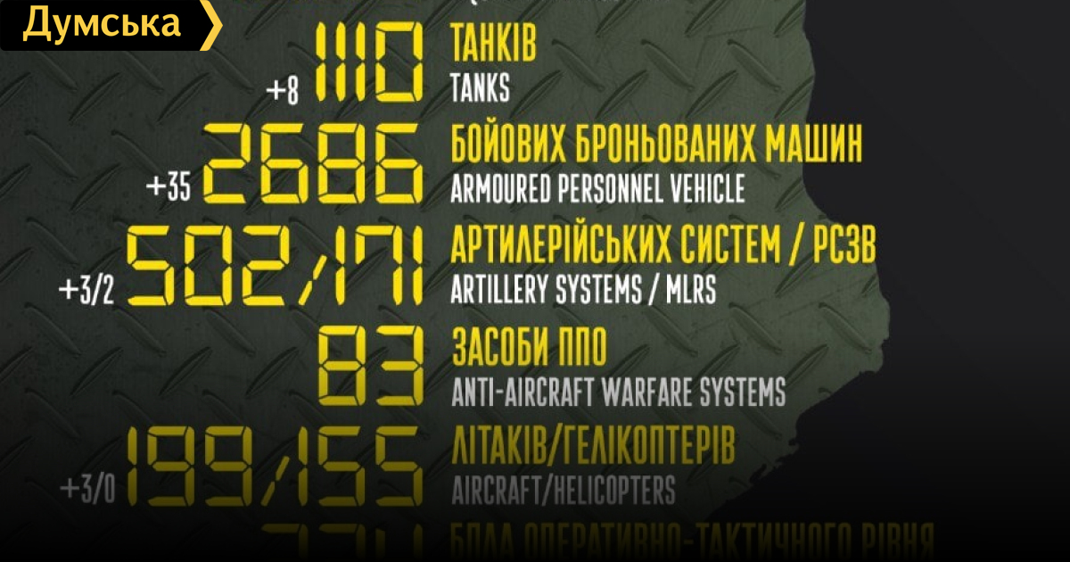 Украинские войска за сутки уничтожили 200 оккупантов, 35 бронемашин, три самолета и корабльОккупанты ежедневно несут тяжелые потери на украинской земле. Вчера список уничтоженных захватчиков увеличился на 200 солдат и офицеров. С начала же полномасштабного вторжения свой конец нашли 24900 российских военных. По данным Генерального штаба Вооруженных сил Украины, вчера были уничтожены восемь вражеских танков (1100) и 35 бронемашин (2686). Сожжены три артиллерийские системы (502) и две реактивные системы залпового огня (171), а также 19 автомобилей (1926). Сбиты три самолета (199). Уничтожен еще один российский военный корабль (11). Вероятно, это фрегат, на котором у острова Змеиный произошел взрыв. СМЕРТЬ РОСІЙСЬКИМ ОКУПАНТАМ! Помітили помилку? Виділяйте слова з помилкою та натискайте control-enter |