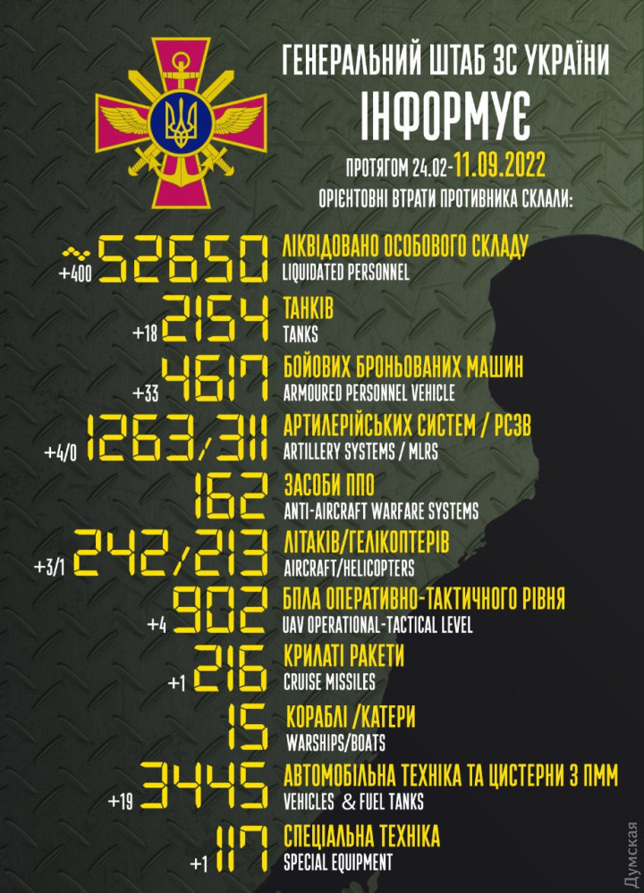 За даними Міністерства оборони України, 10 вересня наші захисники знищили 400 солдатів та офіцерів противника. З початку повномасштабної війни російська армія вже зменшилася на 52 650 військовослужбовців.