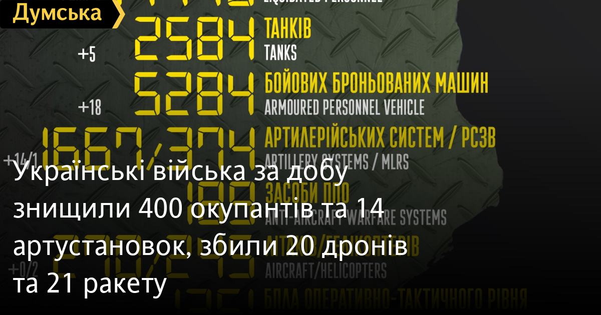 Українські війська за добу знищили 400 окупантів та 14 артустановок, збили 20 дронів та 21 ракету400 рашистів було знищено в Україні 22 жовтня. Загальні втрати противника з початку повномасштабної війни становлять 67470 солдатів і офіцерів. За даними Генерального штабу Збройних сил України, також учора було підбито п'ять танків (2584 з 24 лютого), 18 бронемашин (5284) та 18 вантажівок (4039). Спалено 14 артилерійських установок (1667), одну реактивну систему залпового вогню (374). Збито два вертольоти (245), 20 безпілотників оперативно-тактичного рівня (1361) та 21 крилату ракету (350). СМЕРТЬ РОСІЙСЬКИМ ОКУПАНТАМ! Помітили помилку? Виділяйте слова з помилкою та натискайте control-enter |
