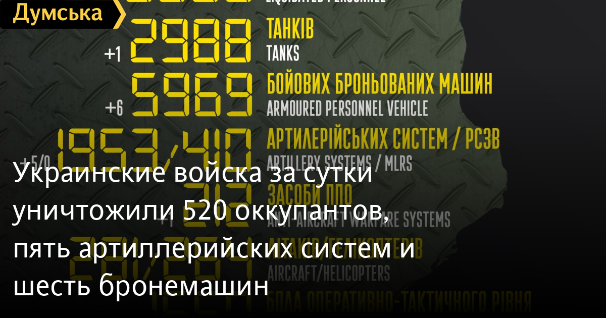 Украинские войска за сутки уничтожили 520 оккупантов, пять артиллерийских систем и шесть бронемашинРоссийская оккупационная группировка в Украине 18 декабря уменьшилась на 520 солдат и офицеров. С начала полномасштабного вторжения уничтожены уже 98 800 рашистов. В Генеральном штабе Вооруженных сил Украины сообщили, что также вчера был подбит вражеский танк (2988 за все время), уничтожены шесть бронемашин (5969), пять артиллерийских установок (1953), одна система ПВО (212), 13 грузовиков (4592) и одна единица спецтехники (175). Кроме того, были сбиты восемь беспилотников оперативно-тактического уровня (1657). СМЕРТЬ РОССИЙСКИМ ОККУПАНТАМ! Заметили ошибку? Выделяйте слова с ошибкой и нажимайте control-enter |