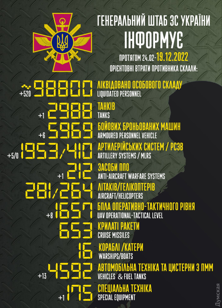 Російське окупаційне угруповання в Україні 18 грудня зменшилося на 520 солдатів і офіцерів. Від початку повномасштабного вторгнення знищено вже 98 800 рашистів.