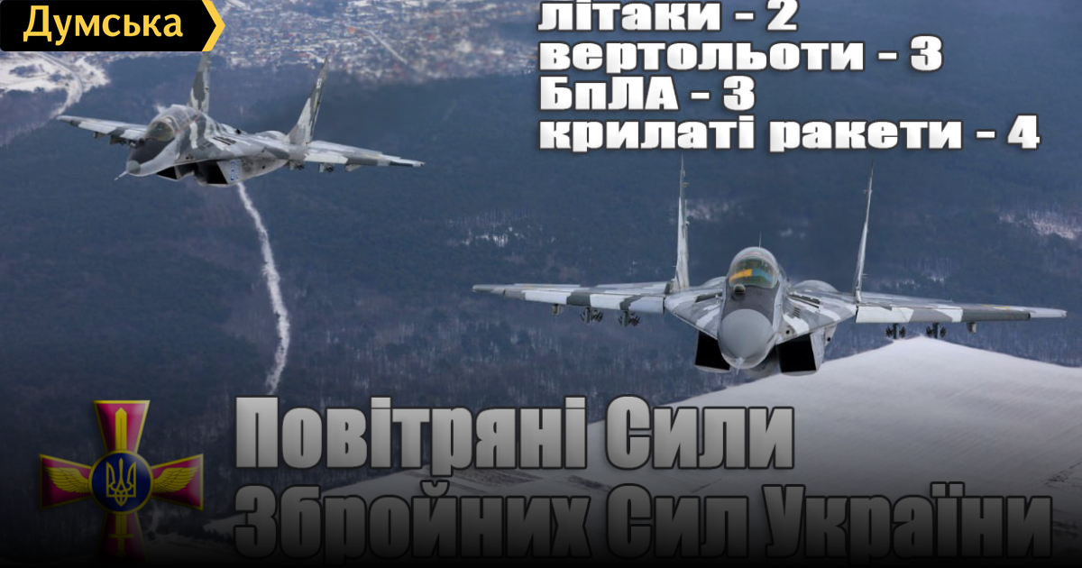 За сутки 18 марта Воздушные силы ВСУ уничтожили десять вражеских целей. Еще две цели — на счету сил ПВО. Об этом говорится в вечерней сводке командования ВС ВСУ. Защитники Украины уничтожили два самолета, три вертолета, три беспилотника и четыре крылатых ракеты. СМЕРТЬ РОСІЙСЬКИМ ОКУПАНТАМ! Помітили помилку? Виділяйте слова з помилкою та натискайте control-enter |