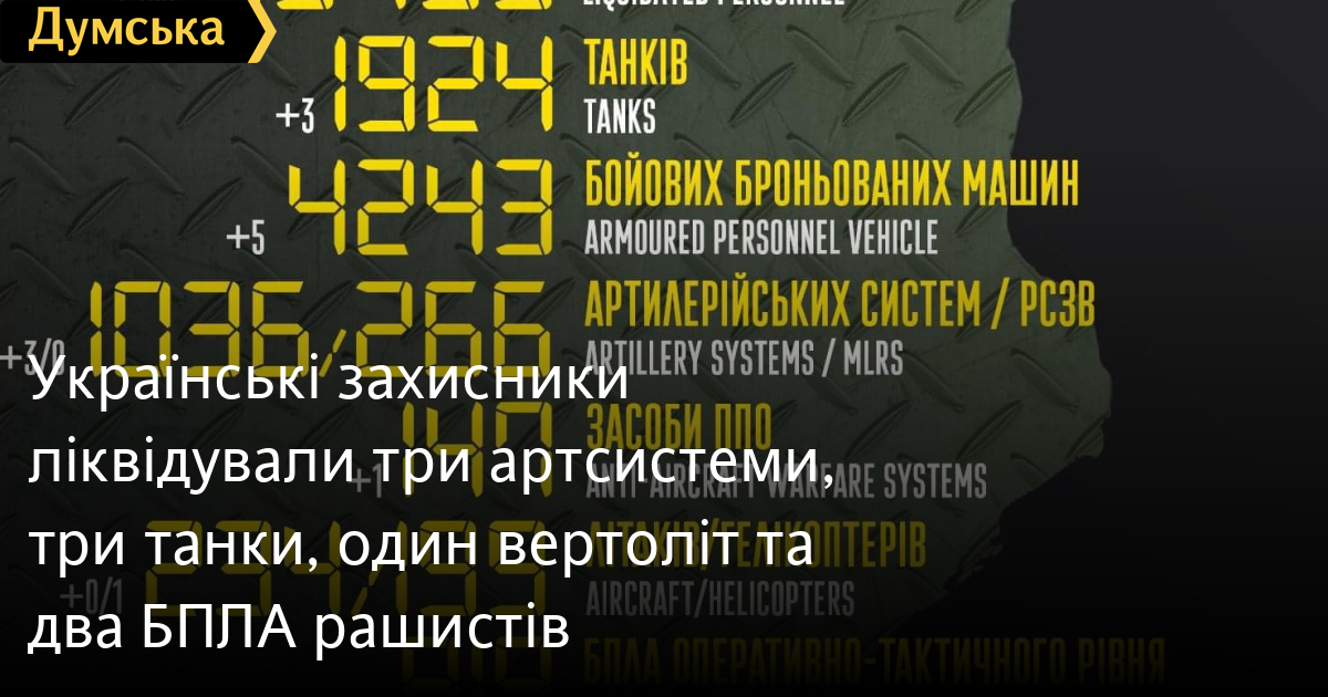 Українські захисники ліквідували три артсистеми, три танки, один вертоліт та два БПЛА рашистівТри артилерійські системи, три танки та один гелікоптер російських нацистів знищили за останню добу Сили оборони України. 150 окупантів убито або в полоні, повідомили в українському Генштабі. Також противник втратив пя’ть бойових броньованих машин, один засіб ППО, два безпілотних літальних апарата оперативно-тактичного рівня та десять одиниць автомобільної техніки. Найбільші втрати противник зазнав на донецькому напрямку. Всього з початку повномасштабної війни українські захисники знищили приблизно: особового складу ‒ близько 45700 (+150) осіб ліквідовано, танків ‒ 1 924 (+3), бойових броньованих машин ‒ 4 243 (+5), артилерійських систем – 1036 (+3), РСЗВ ‒ 266, засоби ППО ‒ 147 (+1), літаків – 234 (+0), гелікоптерів – 199 (+1), БПЛА оперативно-тактичного рівня ‒ 819 (+2), крилаті ракети ‒ 196, кораблі / катери ‒ 15, автомобільної техніки та автоцистерн ‒ 3 160 (+10), спеціальна техніка ‒ 99. СМЕРТЬ РОСІЙСЬКИМ ОКУПАНТАМ! Помітили помилку? Виділяйте слова з помилкою та натискайте control-enter |