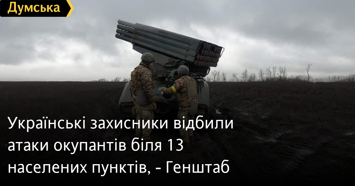 За минулу добу підрозділи Сил оборони відбили атаки окупантів в районах населених пунктів Білогорівка, Червонопопівка, Кузьміне Луганської області та Соледар, Білогорівка, Підгородне, Бахмут, Кліщіївка, Водяне, Курдюмівка, Майорськ, Мар’їнка і Побєда Донецької області.