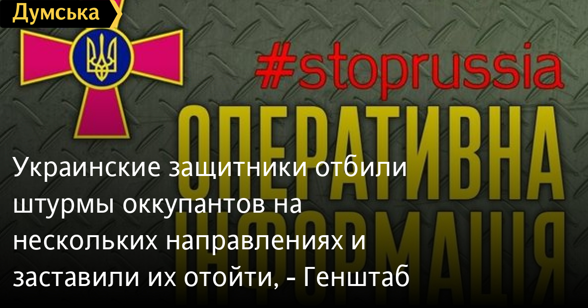 Українські захисники відбили штурми окупантів на декількох напрямках і змусили їх відійти, — ГенштабТриває 157 доба героїчного протистояння української нації російському воєнному вторгненню. Як повідомляється в зведенні Генштабу, на харківському напрямку противник здійснював обстріли позицій наших військ та цивільних об’єктів із танків, ствольної та реактивної артилерії в районах населених пунктів Харків, Світличне, Руські Тишки, Дуванка, Піщане, Верхній Салтів, Коробочкине, Леб’яже, Петрівське, Норцівка та Залиман. Завдав авіаційного удару в районі Мосьпанового. На слов’янському напрямку ворог здійснив артилерійські обстріли в районах Долини, Краснопілля та Мазанівки. Ворог намагався вести штурмові дії біля Бражківки, успіху не мав, відійшов. На донецькому напрямку противник зосереджує зусилля на ураженні військових об’єктів та елементів інфраструктури, намагається створити умови для проведення наступу на бахмутському, авдіївському та новопавлівському напрямках з метою покращення тактичного положення. На краматорському напрямку ворог здійснив артилерійські обстріли в районах Краматорська, Верхньокам’янського, Івано-Дар’ївки та Переїзного. Завдав авіаційного удару поблизу Івано-Дар’ївки. На бахмутському напрямку ворог здійснював обстріли наших військ із усіх наявних вогневих засобів вздовж лінії зіткнення в районах населених пунктів Берестове, Білогорівка, Соледар, Бахмут, Кодема, Травневе, Зайцеве та Нью-Йорк. Завдав авіаційних ударів неподалік Яковлівки та Зайцевого. Вів штурмові дії у напрямках Пилипчатине – Покровське та Доломітне – Травневе, успіху не мав, відійшов. Штурмовими діями з трьох напрямків намагався встановити контроль над населеним пунктом Семигір’я, має частковий успіх, закріплюється на околиці населеного пункту. На авдіївському напрямку противник обстрілював позиції наших військ із танків, ствольної артилерії, реактивних систем залпового вогню вздовж лінії зіткнення та в районах населених пунктів Новобахмутівка, Яснобродівка, Авдіївка, Невельське, Первомайське і Красногорівка. Завдав авіаудару біля Авдіївки. З метою покращення тактичного положення вів штурмові дії у напрямках Новоселівка Друга – Красногорівка, Спартак – Авдіївка, успіху не мав, відійшов. Вів повітряну розвідку позицій наших військ БпЛА. На новопавлівському напрямку відзначено обстріли біля Новосілки, Мар’їнки, Микільського, Вугледара, Пречистівки, Великої Новосілки та авіаудар неподалік Мар’їнки. Ворог вів штурмові дії у напрямку Єгорівка — Павлівка, успіху не мав, відійшов. На запорізькому напрямку противник активних бойових дій не вів, здійснював обстріли позицій наших військ із застосуванням ствольної артилерії, РСЗВ та озброєння танків в районах населених пунктів Залізничне, Новомихайлівка, Білогір’я, Новоандріївка. Вів повітряну розвідку положення наших військ БпЛА. На південнобузькому напрямку ворог вів повітряну розвідку, здійснював обстріли позицій наших військ із ствольної та реактивної артилерії в районах населених пунктів Трудолюбівка, Потьомкине, Кам’яне, Кар’єрне, Новогригорівка, Велике Артакове, Лозове, Кобзарці, Широке, Киселівка, Зоря, Посад-Покровське, Степова Долина, Таврійське, Миколаїв та Солончаки. Намагався створити сприятливі умови для наступу в напрямку Брускінське 