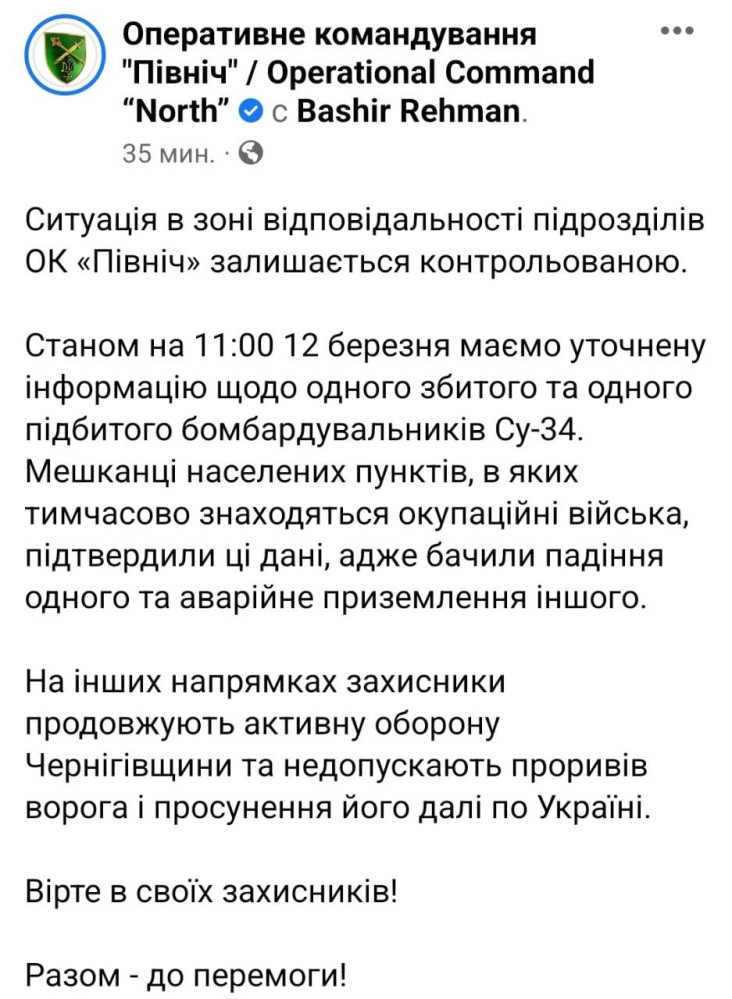 Истребитель-бомбардировщик российских нацистов Су-34 был сбит украинскими защитниками в зоне ответственности подразделений оперативного командования «Север».