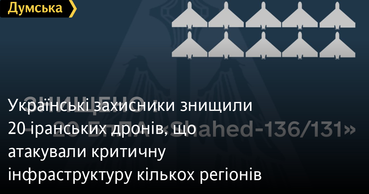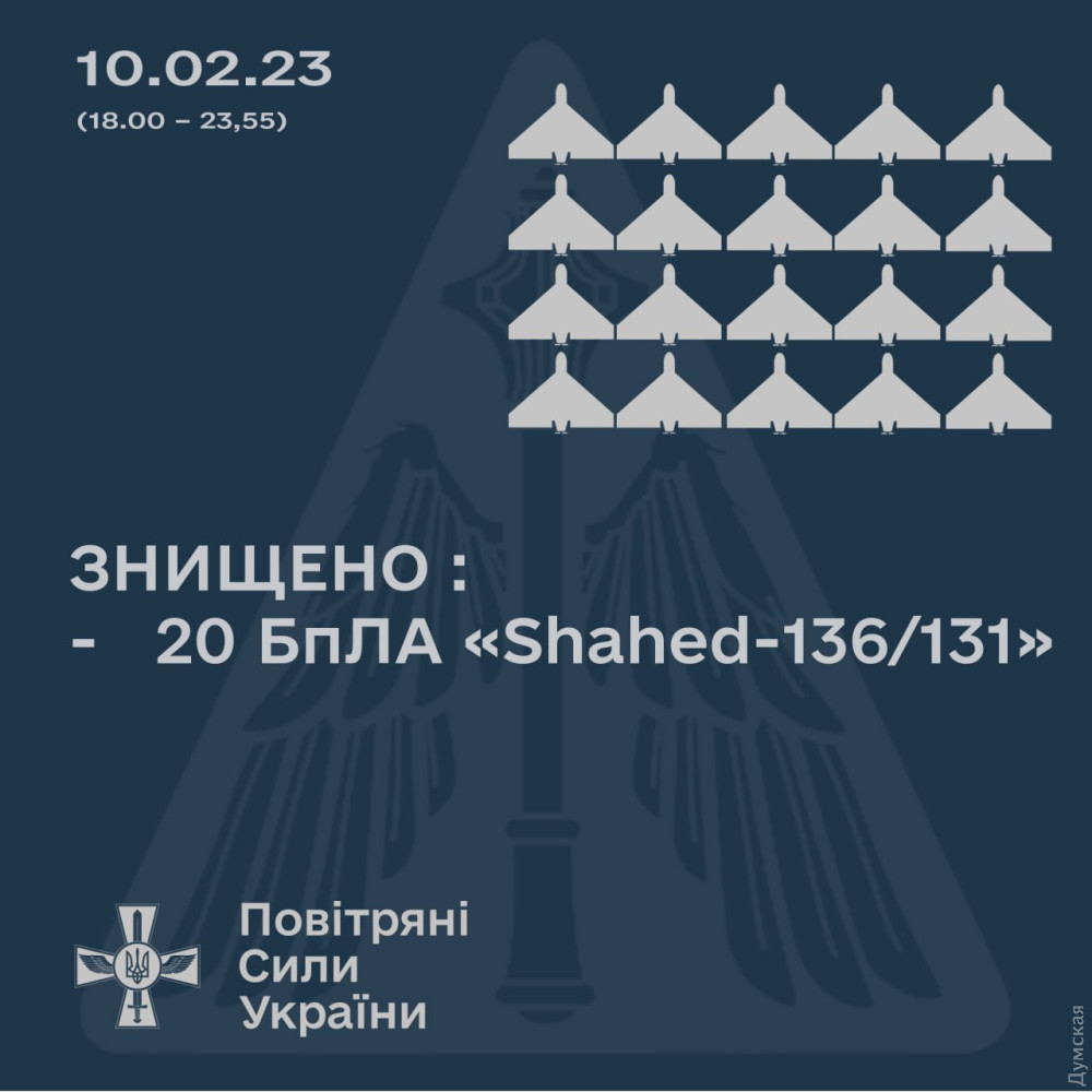 20 ударних дронів-камікадзе Shahed-136/131, що атакували критичну інфраструктуру різних областей України, збили Сили оборони ввечері 10 лютого.