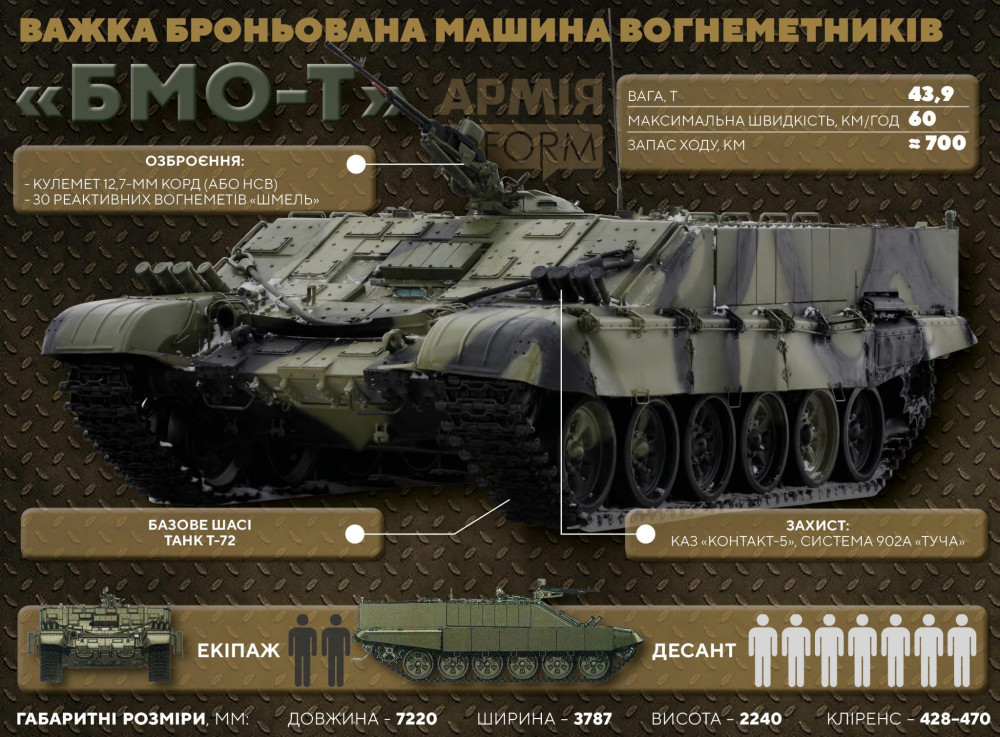 Экипаж БМО-Т — два человека, еще семь человек — десант. Как основное вооружение используется дистанционно управляемый зенитный 12,7-мм пулемет «Корд» или НСВ. Отделение огнеметчиков вооружено реактивными пехотными огнеметами «Шмель».