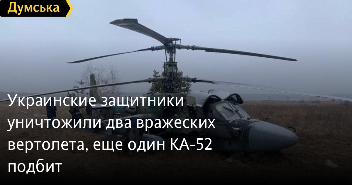 Силы обороны Украины сегодня подбили два вертолета КА-52 российских оккупантов на Запорожском направлении и один в Киевской области.