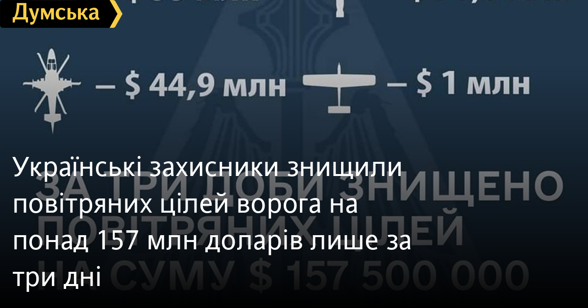 Українські захисники знищили повітряних цілей ворога на понад 157 млн доларів лише за три дніПовітряні цілі ворога на 157,5 млн доларів знищили українські військові протягом 5 –7 вересня. Йдеться лише про засоби повітряного нападу: крилаті ракети, літаки та гелікоптери, знищені підрозділами зенітних ракетних військ Повітряних Сил, ППО Сухопутних військ та ДШВ, повідомляють в Генеральному штабі. Одні з найдорожчих і найтехнологічніших ракет на озброєнні рф – це, безумовно, крилата ракета Х-101. Орієнтовна вартість – 13 мільйонів доларів за одиницю. Збили їх шість, отже маємо 78 млн доларів. Крім того: - дві керовані авіаційні ракети Х-59 – 600 тис. (300 тис. доларів за одиницю); - два ударних вертольоти Ка-52 на 32, 4 млн доларів (16,2 млн доларів за од.) та ударний вертоліт Мі-24 (12,5 млн доларів за од.); - воїнами ДШВ знищено три штурмовики Су-25 на суму 33 млн доларів (11 млн доларів за од.); - десять безпілотників оперативно-тактичного рівня типу «Орлан-10» – 1 млн доларів (100 тис. доларів за од.). Протиповітряна оборона продовжує працювати на перемогу. Повітряні Сили та ППО усіх Сил оборони України знищують окупантів як на небі, так і на землі. У російських «мухосранськах» повинні знати, чому живуть так погано, чому більшість країни не газифікована, чому нема доріг, чому досі живуть в дерев’яних бараках і ходять в туалет на вулицю. СМЕРТЬ РОСІЙСЬКИМ ОКУПАНТАМ! Помітили помилку? Виділяйте слова з помилкою та натискайте control-enter |