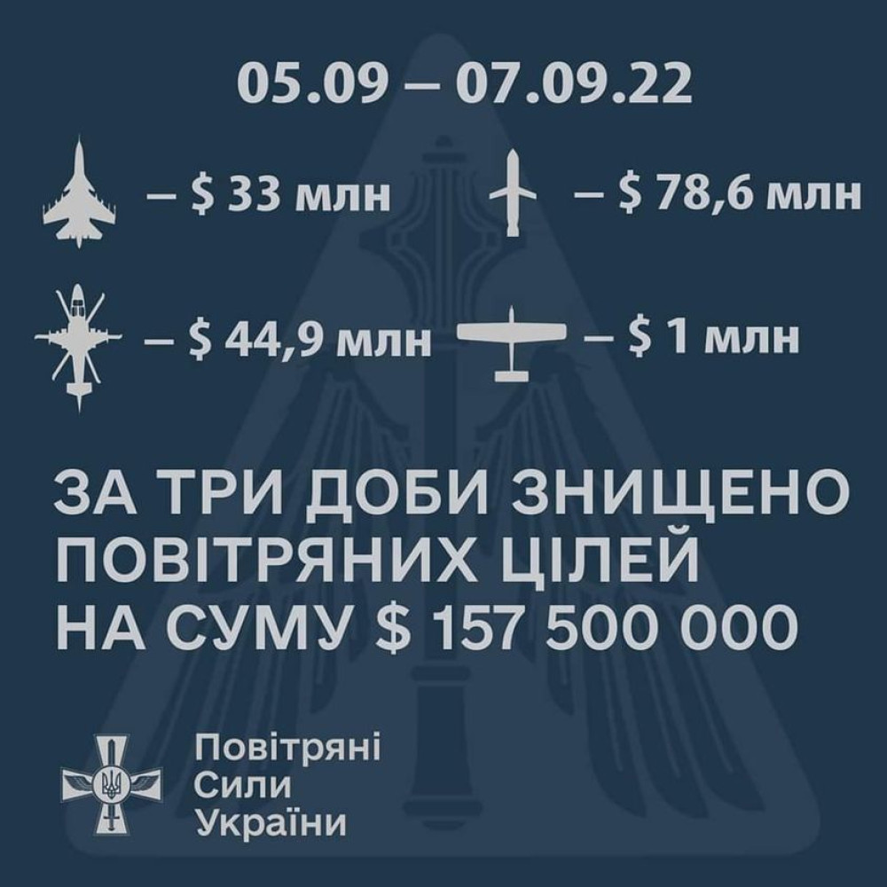 Повітряні цілі ворога на 157,5 млн доларів знищили українські військові протягом 5 –7 вересня.