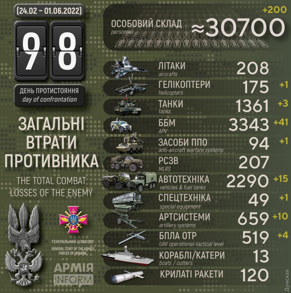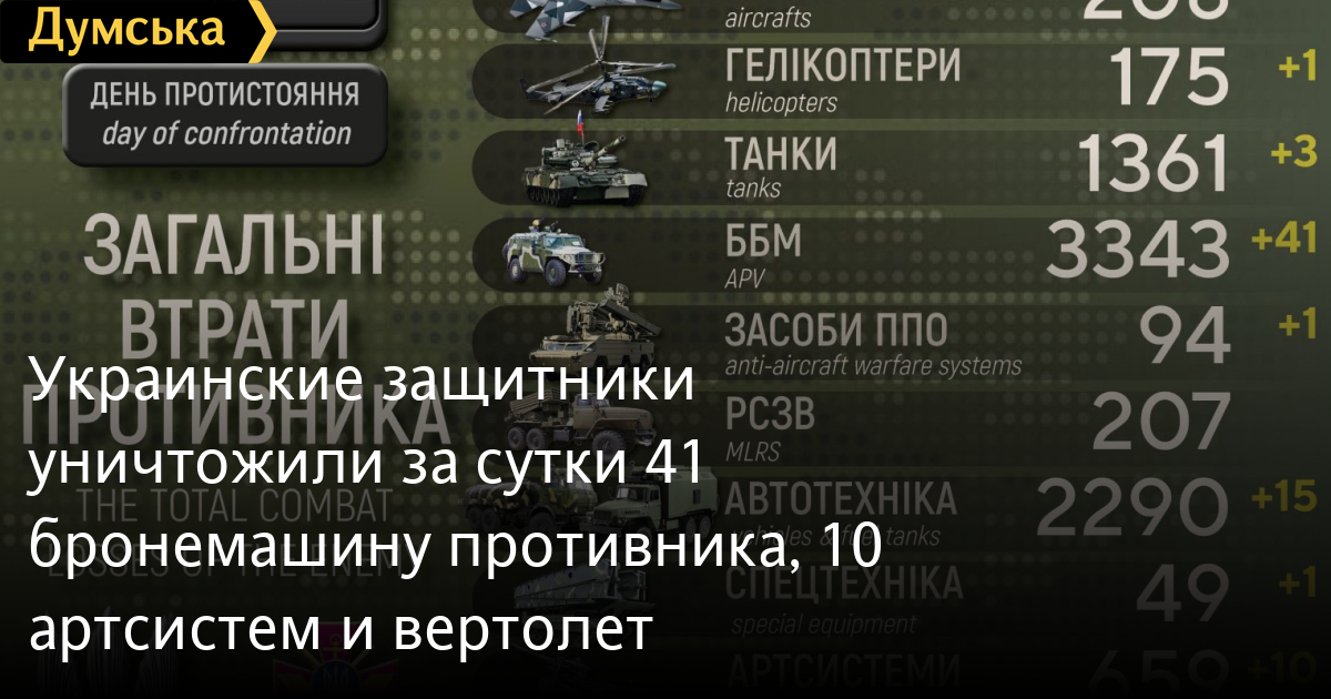 Кроме того, как сообщает Генштаб Вооруженных сил, оккупанты потеряли в Украине вертолет, три танка, одно средство ПВО, 4 беспилотника оперативно-тактического уровня, 15 автомобилей или автоцистерн и одна единица спецтехники.