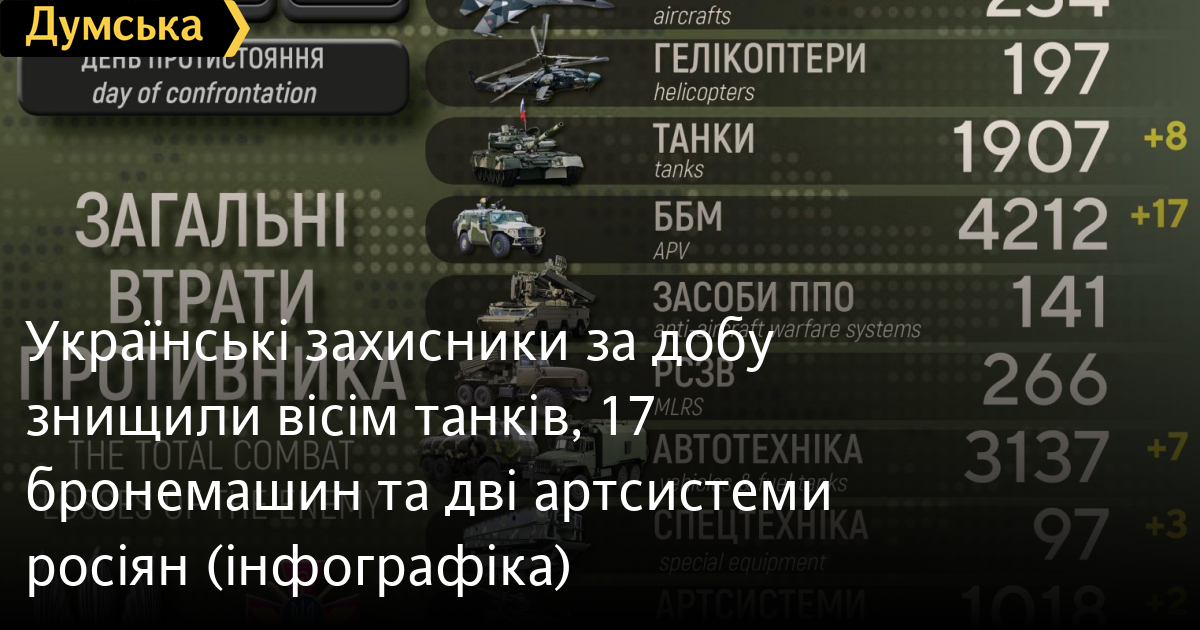 Вісім танків, 17 бойових броньованих машин та дві артилерійські системи російських нацистів знищили за останню добу Сили оборони України.200 окупантів убито або в полоні, повідомили в українському Генштабі.Також противник втратив вісім безпілотних літальних апаратів оперативно-тактичного рівня, сім одиниць автомобільної техніки та автоцистерн та три — спецтехніки.Найбільших втрат противник зазнав на донецькому напрямку.Всього з початку повномасштабної війни українські захисники знищили приблизно: особового складу ‒ близько 44 900 (+200) осіб ліквідовано, танків ‒ 1 907 (+8) од, бойових броньованих машин ‒ 4 212 (+17) од, артилерійських систем – 1018 (+2) од, РСЗВ ‒ 266 (+0) од, засоби ППО ‒ 141 (+0) од, літаків – 234 (+0) од, гелікоптерів – 197 (+0) од, БПЛА оперативно-тактичного рівня ‒ 803 (+8), крилаті ракети ‒ 190 (+0), кораблі / катери ‒ 15 (+0) од, автомобільної техніки та автоцистерн ‒ 3 137 (+7) од, спеціальна техніка ‒ 97 (+3).