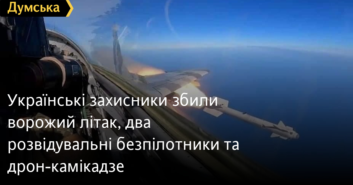 Українські захисники збили ворожий літак, два розвідувальні безпілотники та дрон-камікадзеРосійський штурмовик Су-25, два безпілотні літальні апарати «Орлан-10» і дрон-камікадзе збили українські захисники протягом доби. Про це у вечірньому зведенні повідомляє Генштаб Збройних сил України. Авіація Сил оборони за добу завдала 20 ударів по районах зосередження окупантів, сім - по зенітно-ракетних комплексах на вогневих позиціях, а також 2 удари — по важливих об'єктах противника. А підрозділи ракетних військ і артилерії вразили батарею реактивних систем залпового вогню противника. СМЕРТЬ РОСІЙСЬКИМ ОКУПАНТАМ! Помітили помилку? Виділяйте слова з помилкою та натискайте control-enter |