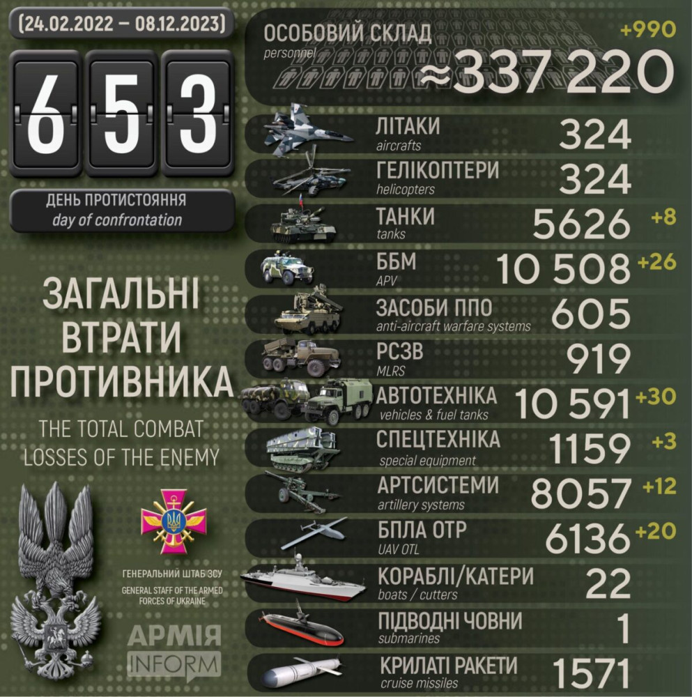 Усього з початку повномасштабного вторгнення втрати ворога склали: