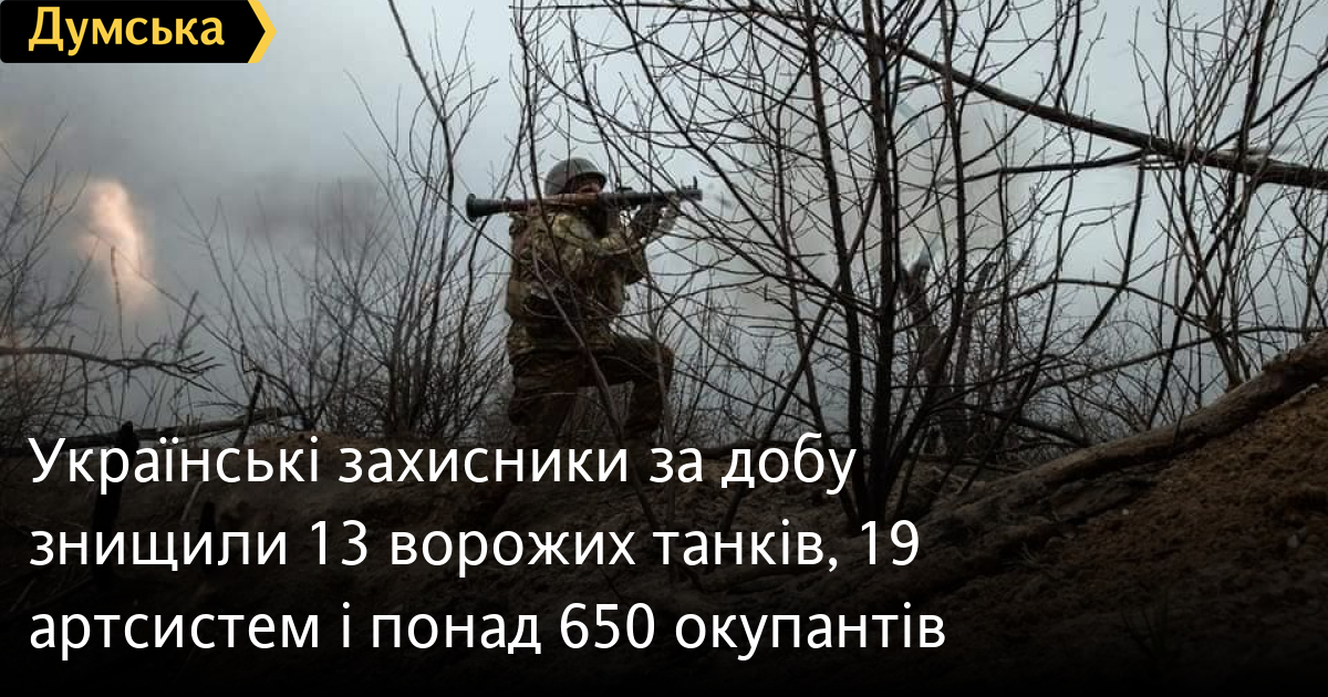 Українські захисники за добу знищили 13 ворожих танків, 19 артсистем і понад 650 окупантів660 осіб, 13 танків і 19 артсистем втратили окупанти в Україні за минулу добу. Крім того, за даними Генерального штабу Збройних сил України, наші захисники також знищили 11 бойових броньованих машин, дві РСЗВ, один засіб ППО, 20 БПЛА оперативно-тактичного рівня, 18 одиниць автомобільної техніки і три одиниці спецтехніки. Усього з початку повномасштабного вторгнення втрати ворога склали: особового складу — 168 150 осіб; танків ‒ 3570 одиниць; бойових броньованих машин ‒ 6898 одиниць; артилерійських систем – 2608 одиниць; РСЗВ – 511 одиниць; засоби ППО ‒ 273 одиниці; літаків – 305 одиниць; гелікоптерів – 290 одиниць; БПЛА оперативно-тактичного рівня – 2203; крилаті ракети ‒ 909; кораблі /катери ‒ 18 одиниць; автомобільної техніки та автоцистерн – 5452 одиниці; спеціальна техніка ‒ 273. СМЕРТЬ РОСІЙСЬКИМ ОКУПАНТАМ! Помітили помилку? Виділяйте слова з помилкою та натискайте control-enter |