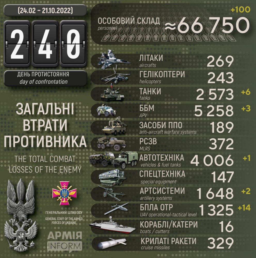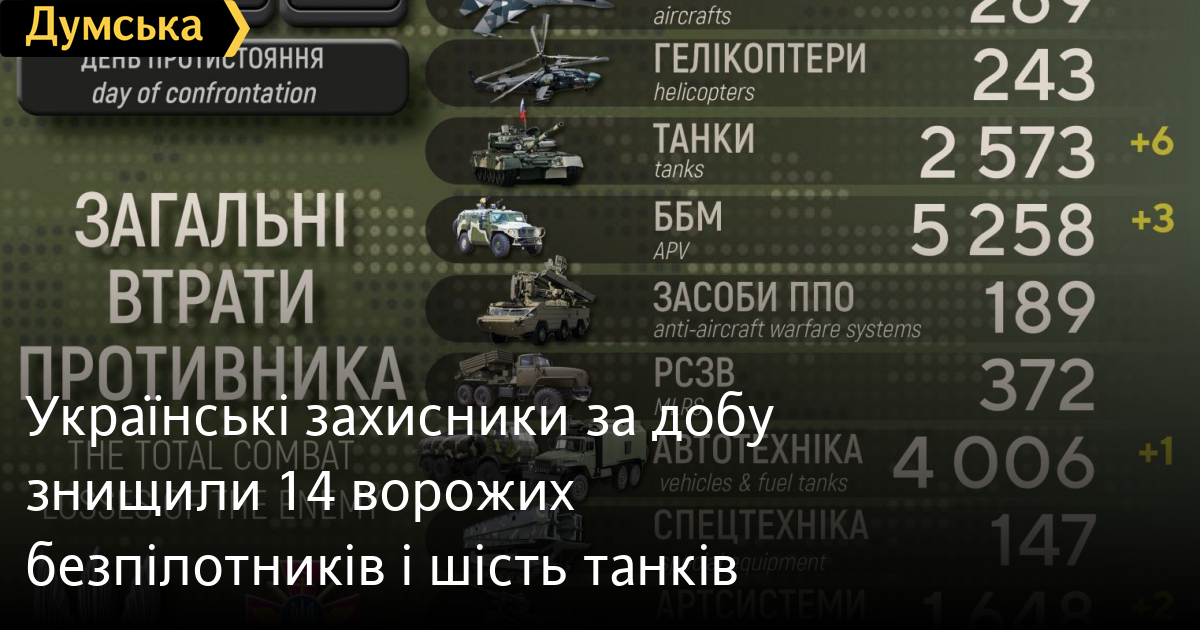 Крім того, за даними Генерального штабу Збройних сил України, наші захисники також знищили три бойові броньовані машини, дві артсистеми і одну одиницю автомобільної техніки.