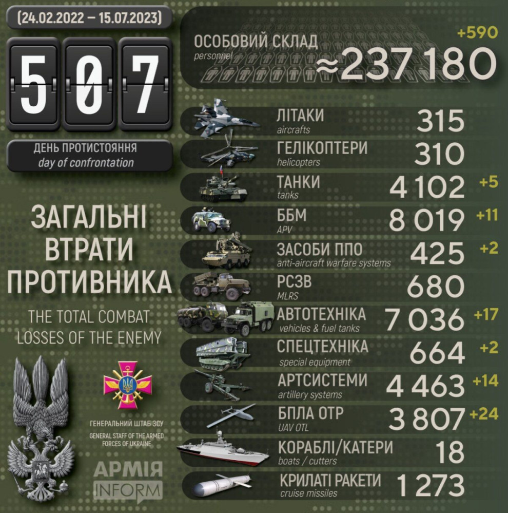 Українські захисники за добу знищили 14 ворожих артсистем, 24 дрони та майже 600 окупантів590 військових, 14 артсистем, 24 дрони втратили окупанти в Україні за минулу добу. Крім того, за даними Генерального штабу Збройних сил України, наші захисники знищили 5 танків, 11 бойових броньованих машин, два засоби ППО, 17 одиниць автомобільної техніки та 2 одиниці спецтехніки. Усього з початку повномасштабного вторгнення втрати ворога склали: особового складу ‒ 237 180 (+590) осіб ліквідовано танків ‒ 4102 (+5) бойових броньованих машин ‒ 8019 (+11) артилерійських систем ‒ 4463 (+14) РСЗВ ‒ 680 (0) засоби ППО ‒ 425 (+2) літаків ‒ 315 (0) гелікоптерів ‒ 310 (0) БПЛА оперативно-тактичного рівня ‒ 3807 (+24) крилаті ракети ‒ 1273 (0) кораблі / катери ‒ 18 (0) автомобільної техніки та автоцистерн ‒ 7036 (+17) спеціальна техніка ‒ 664 (+2) СМЕРТЬ РОСІЙСЬКИМ ОКУПАНТАМ! Помітили помилку? Виділяйте слова з помилкою та натискайте control-enter |