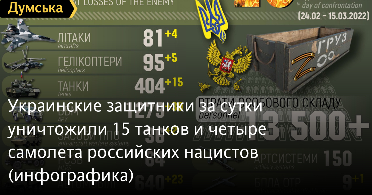 Также враг потерял уже 81 самолет (четыре было сбито за минувшие сутки), 95 вертолетов (пять за сутки), 404 танка (15), 1279 боевых бронированных машин (30), 36 средств ПВО (2), 64 системы залпового огня, 640 автомобилей (23), 60 цистерн с горюче-смазочными материалами, 150 артсистем, девять беспилотных летательных аппаратов оперативно-тактического уровня (1), два катера и один корабль.