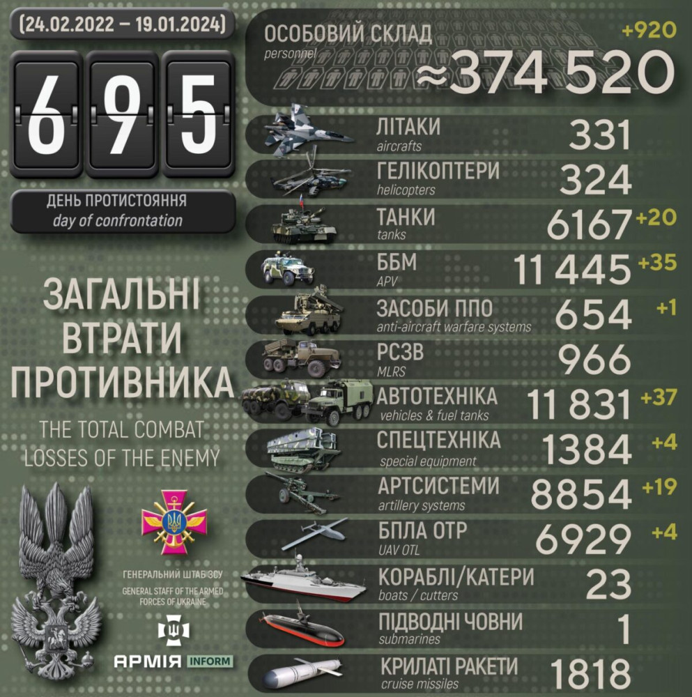 Усього з початку повномасштабного вторгнення втрати ворога склали:
