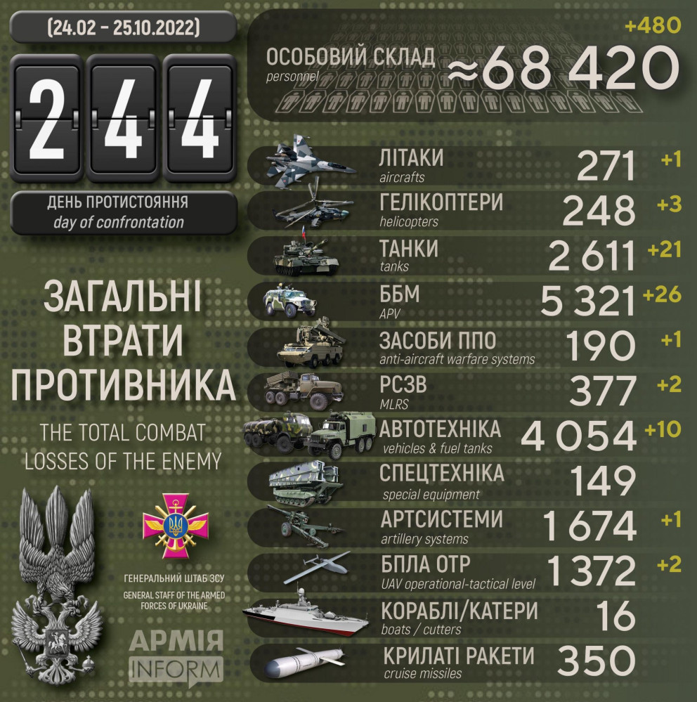 Українські захисники за добу знищили 21 танк, 26 бронемашин та три гелікоптери росіян (інфографіка)Три гелікоптери, 21 танк та 26 бронемашин російських нацистів знищили за минулу добу Сили оборони України. 480 окупантів убито або в полоні, повідомили в українському Генштабі. Також противник втратив артсистему та дві реактивні системи залпового вогню, літак, три дрони та 10 одиниць автомобільної техніки. Всього з початку повномасштабної війни українські захисники знищили приблизно: особового складу ‒ близько 68420 (+480) осіб ліквідовано, танків ‒ 2611 (+21) од, бойових броньованих машин ‒ 5321 (+26) од, артилерійських систем – 1674 (+1) од, РСЗВ – 377 (+2) од, засоби ППО ‒ 190 (+1) од, літаків – 271 (+1) од, гелікоптерів – 248 (+3) од, БПЛА оперативно-тактичного рівня – 1372 (+2), крилаті ракети ‒ 350 (+0), кораблі /катери ‒ 16 (+0) од, автомобільної техніки та автоцистерн – 4054 (+10) од, спеціальна техніка ‒ 149 (+0). СМЕРТЬ РОСІЙСЬКИМ ОКУПАНТАМ! Помітили помилку? Виділяйте слова з помилкою та натискайте control-enter |