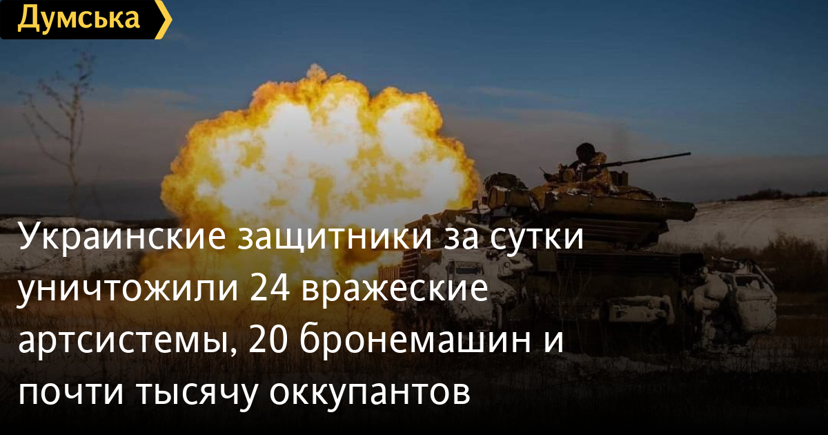 Українські захиснкии за добу знищили 24 ворожі артсистеми, 20 бронемашин та майже тисячу окупантів980 осіб, одну крилату ракета та 14 танків втратили російські окупанти минулої доби. Крім того, за даними Генерального штабу Збройних сил України, наші захисники також знищили 20 бойових броньованих машин, 24 артсистеми, одну РСЗВ, два засоби ППО, чотири БПЛА оперативно-тактичного рівня, 31 одиницю автомобільної техніки та три одиниці спецтехніки. Усього з початку повномасштабного вторгнення втрати ворога склали: особового складу — 370 980 осіб; танків ‒ 6089 одиниць; бойових броньованих машин ‒ 11322 одиниці; артилерійських систем – 8771 одиницю; РСЗВ – 958 одиниць; засоби ППО ‒ 650 одиниць; літаків – 329 одиниць; гелікоптерів – 324 одиниці; БПЛА оперативно-тактичного рівня – 6865 одиниць; крилаті ракети ‒ 1815; кораблі /катери ‒ 23 одиниці; підводні човни — 1 одиницю; автомобільної техніки та автоцистерн – 11698 одиниць; спеціальна техніка ‒ 1356. СМЕРТЬ РОСІЙСЬКИМ ОКУПАНТАМ! Помітили помилку? Виділяйте слова з помилкою та натискайте control-enter |