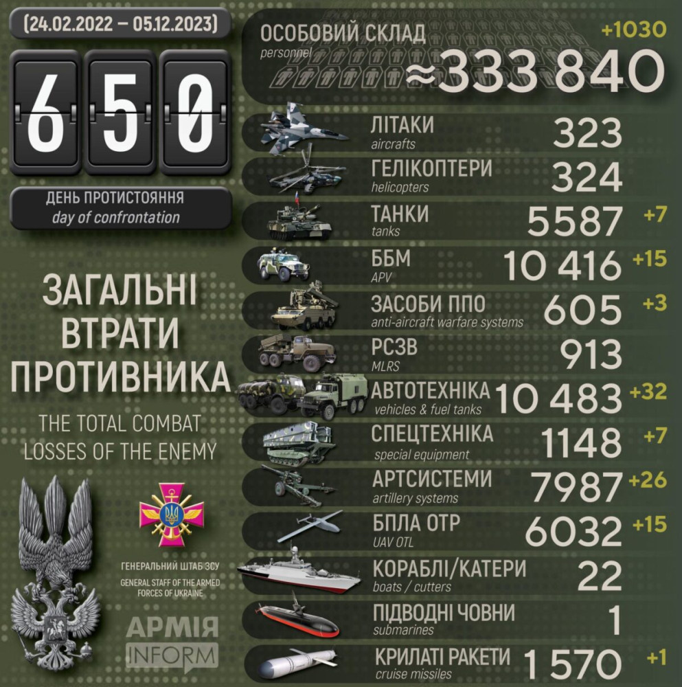 Усього з початку повномасштабного вторгнення втрати ворога склали: