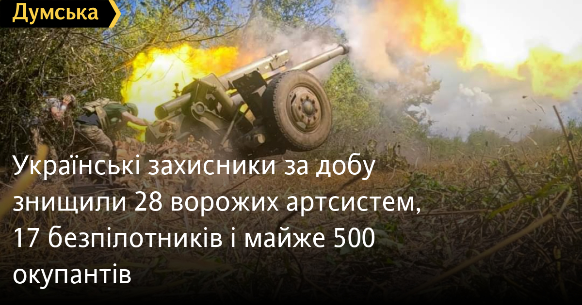 Українські захисники за добу знищили 28 ворожих артсистем, 17 безпілотників і майже 500 окупантів470 осіб, 13 танків і 28 артсистем втратили російські окупанти минулої доби. Крім того, за даними Генерального штабу Збройних сил України, наші захисники також знищили чотири бойові броньовані машини, п'ять РСЗВ, чотири засоби ППО, 17 БПЛА оперативно-тактичного рівня і 34 одиниці автомобільної техніки. Усього з початку повномасштабного вторгнення втрати ворога склали: особового складу — 271 440 осіб; танків ‒ 4612 одиниць; бойових броньованих машин ‒ 8814 одиниць; артилерійських систем – 5972 одиниці; РСЗВ – 774 одиниці; засоби ППО ‒ 521 одиницю; літаків – 315 одиниць; гелікоптерів – 316 одиниць; БПЛА оперативно-тактичного рівня – 4714; крилаті ракети ‒ 1455; кораблі /катери ‒ 20 одиниць; підводні човни — 1 одиницю; автомобільної техніки та автоцистерн – 8492 одиниці; спеціальна техніка ‒ 889. СМЕРТЬ РОСІЙСЬКИМ ОКУПАНТАМ! Помітили помилку? Виділяйте слова з помилкою та натискайте control-enter |