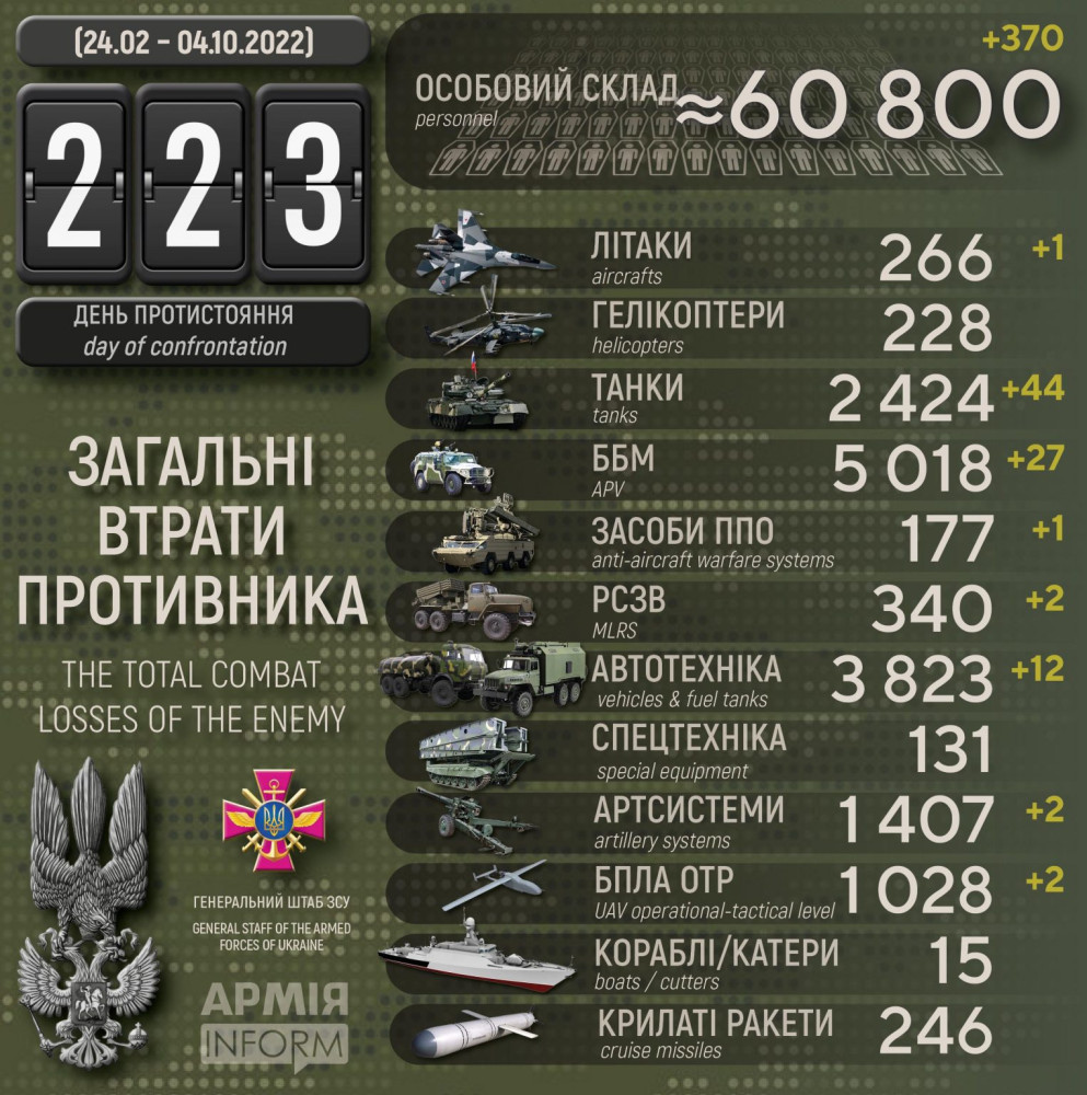 Усього з початку повномасштабного вторгнення втрати ворога склали: