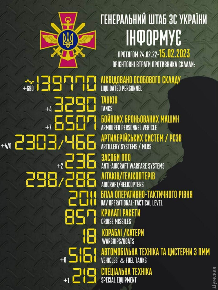 690 російських солдатів і офіцерів полягли в Україні 14 лютого. Від початку повномасштабної війни було знищено вже 139 тисяч 770 загарбників.