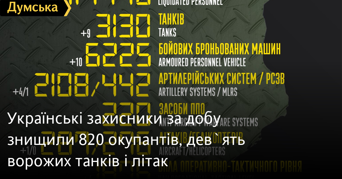 У Генеральному штабі Збройних сил України також повідомили про знищення за останню добу дев'яти ворожих танків (3130 за весь час), десяти бронемашин (6225), чотирьох артилерійських систем (2108) і однієї реактивної системи залпового вогню (442), 12 вантажівок (4889).