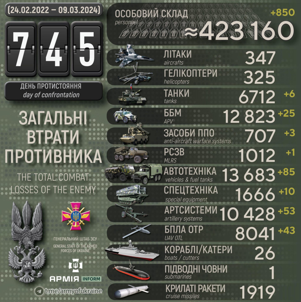 Українські захисники за добу знищили понад 50 артсистем і 10 одиниць спецтехніки росіян (інфографіка)Серйозних втрат зазнали російські окупаційні війська за минулу добу. Як повідомляє Генштаб Збройних сил України, захисники відправили на той світ 850 солдатів і офіцерів ворога. Крім того, вони знищили шість танків, 25 бойових бронемашин, 53 артсистеми (!), одну установку РСЗВ, три засоби ППО, 43 безпілотники оперативно-тактичного рівня, 85 автомашин і цистерн, 10 одиниць спецтехніки. За автомобілями та спецтехнікою результативність Сил оборони наближається до показників весни 2022 року. Загалом від початку повномасштабного вторгнення росіяни втратили вбитими й пораненими 420 270 осіб, 6712 танків, 12 723 ББМ, 1012 установок РСЗВ, 707 засобів ППО, 347 літаків, 325 гелікоптерів, 8041 БПЛА, 1919 крилатих ракет, 26 кораблів і катерів, один підводний човен, 13683 одиниці автомобільної техніки та автоцистерн, 1666 одиниць спеціальної техніки. СМЕРТЬ РОСІЙСЬКИМ ОКУПАНТАМ! Помітили помилку? Виділяйте слова з помилкою та натискайте control-enter |